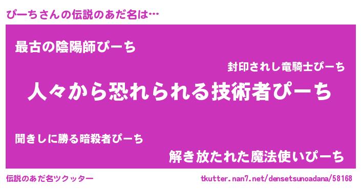 | 男性向けラノベタイトル風あだ名 | 『おまえをオタクにしてやるから、俺をぴーちにしてくれ! 』 |