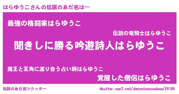 | 男性向けラノベタイトル風あだ名 | 『はらゆうこという概念が存在しない退屈な世界 』 |