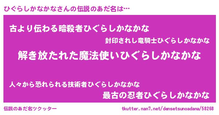 | 男性向けラノベタイトル風あだ名 | 『ひぐらしかなかなの嫁は女の子じゃないと思った?』 |