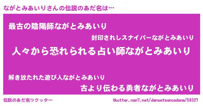 | 女子向けラノベタイトル風あだ名 | 『ながとみあいり夫妻のなれそめ』 |