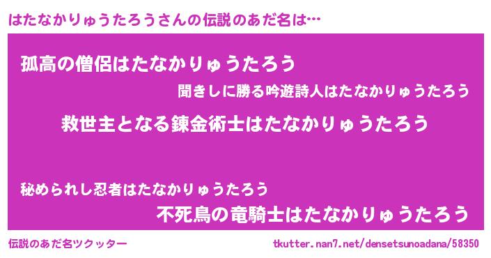 | 男性向けラノベタイトル風あだ名 | 『はたなかりゅうたろう~年齢イコール彼女いない歴の魔法使い~』 |