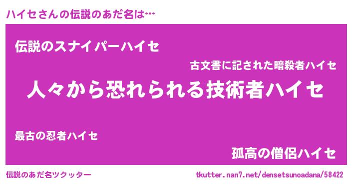 | ヒーロー風カッコイイあだ名 | 『仮面ハイダー』『最強戦士ハイセ』 |