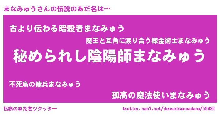| 男性向けラノベタイトル風あだ名 | 『マナミュウスレイヤー』 |