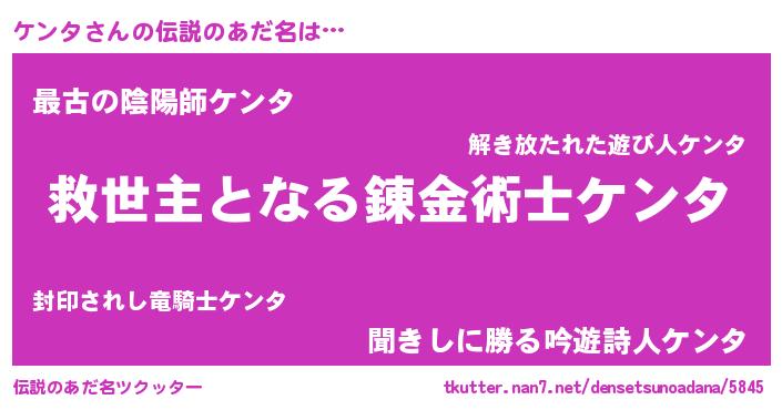 | 男性向けラノベタイトル風あだ名 | 『この素晴らしい世界にケンタを!』 |