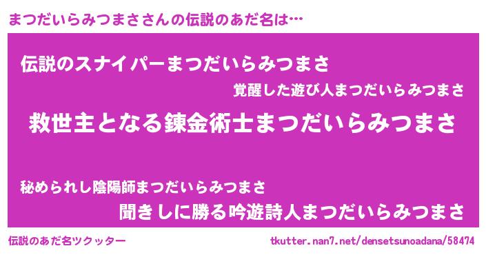 | 男性向けラノベタイトル風あだ名 | 『Re:まつだいらみつまさから始める異世界生活』 |
