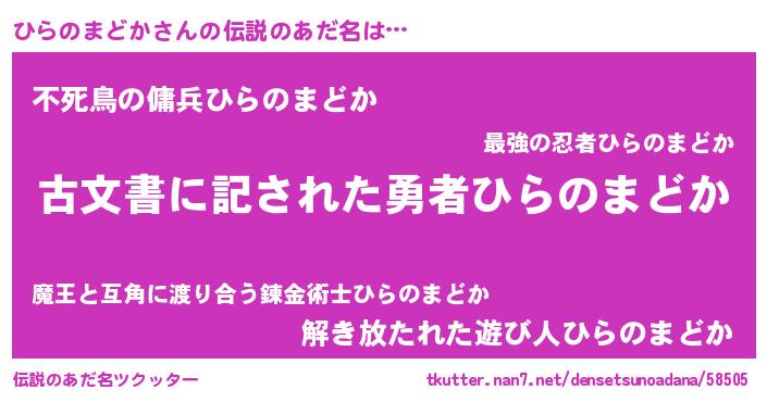 | ヒーロー風カッコイイあだ名 | 『ネオヒラノマドカ』『仮面ヒラダー』 |