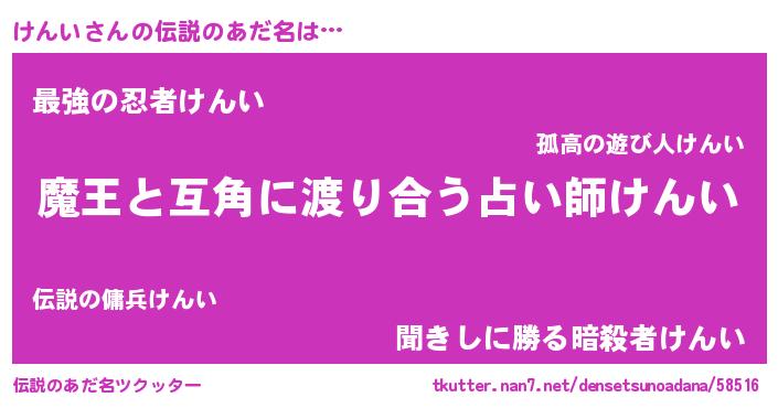| ヒーロー風カッコイイあだ名 | 『愛の使者けんい』『最強戦士ケンイ』 |