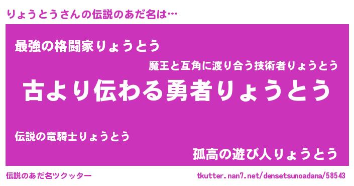 | ヒーロー風カッコイイあだ名 | 『仮面リョダー』『究極戦士リョウトウ』 |