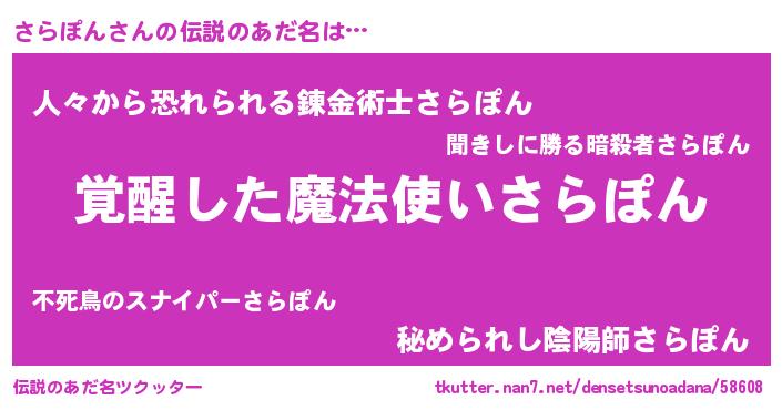| 男性向けラノベタイトル風あだ名 | 『さらぽんの嫁は女の子じゃないと思った?』 |