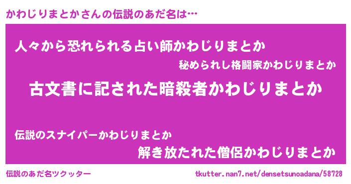 | 胡散臭い通販商品みたいなあだ名 | 『あなたにだけ特別に提供する限定10本のレアな日本酒…その名も「かわじりまとか」』 |
