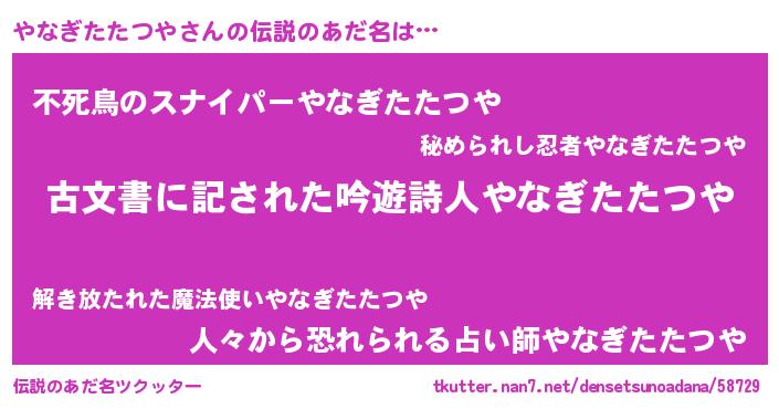 | ヘコむあだ名 | 『やなぎたたつや(小並感)』『やなもー』 |