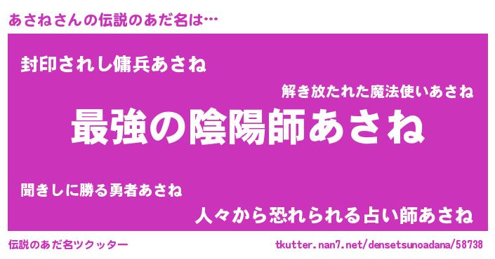 | 男性向けラノベタイトル風あだ名 | 『あさね~年齢イコール彼女いない歴の魔法使い~』 |