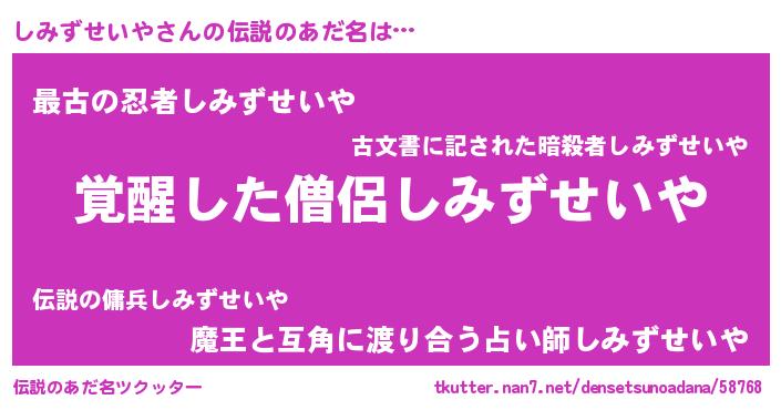 | ヒーロー風カッコイイあだ名 | 『炎刃騎士シミ』『愛の使者しみずせいや』 |