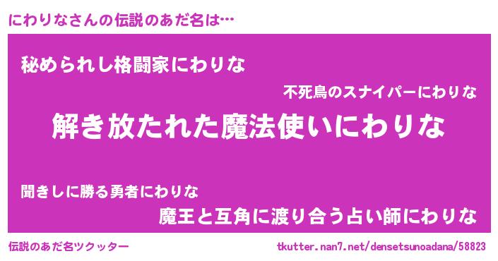 | 男性向けラノベタイトル風あだ名 | 『魔弾の王とにわりな』 |