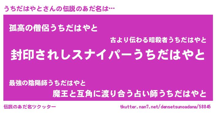 | 男性向けラノベタイトル風あだ名 | 『うちのうちだはやとが世界を掌握している!』 |
