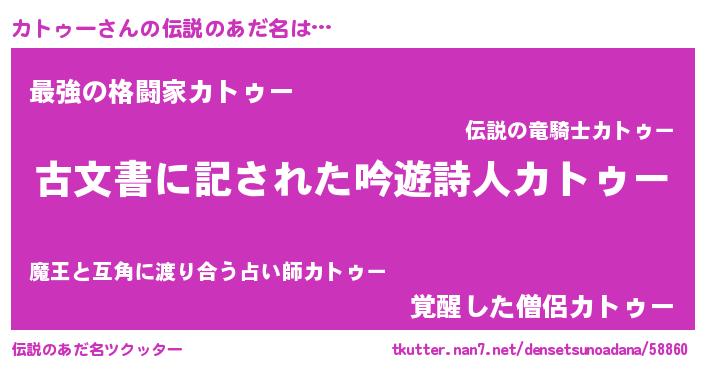| 意味不明あだ名 | 『永久保存カトゥー』『自称カトゥー』 |