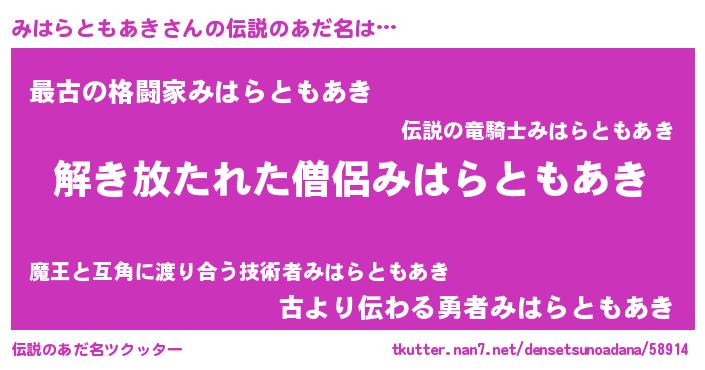 | 男性向けラノベタイトル風あだ名 | 『みはらともあきの嫁は女の子じゃないと思った?』 |