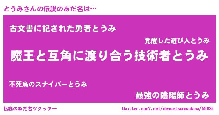 | ヒーロー風カッコイイあだ名 | 『愛の使者とうみ』『最強戦士トウミ』 |