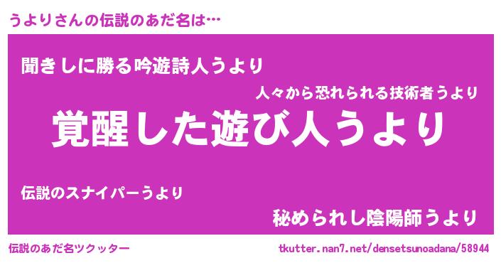 | 男性向けラノベタイトル風あだ名 | 『うより~年齢イコール彼女いない歴の魔法使い~』 |