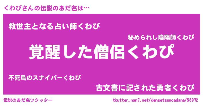 | 男性向けラノベタイトル風あだ名 | 『この素晴らしい世界にくわぴを!』 |