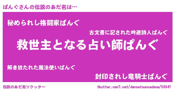 | 男性向けラノベタイトル風あだ名 | 『ぱんぐに滅ぼされるだけの簡単なお仕事です』 |