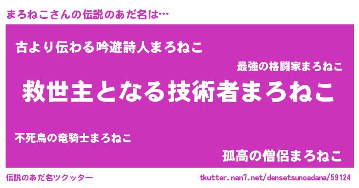 | 男性向けラノベタイトル風あだ名 | 『まろねこに滅ぼされるだけの簡単なお仕事です』 |