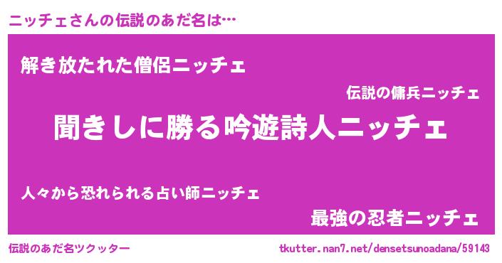 | 男性向けラノベタイトル風あだ名 | 『ニッチェという概念が存在しない退屈な世界 』 |