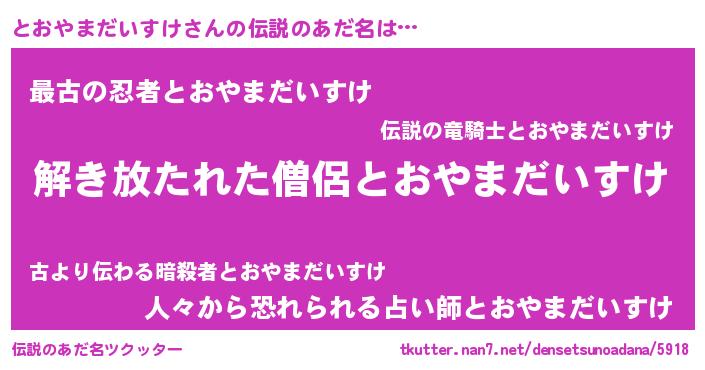 | 男性向けラノベタイトル風あだ名 | 『魔弾の王ととおやまだいすけ』 |