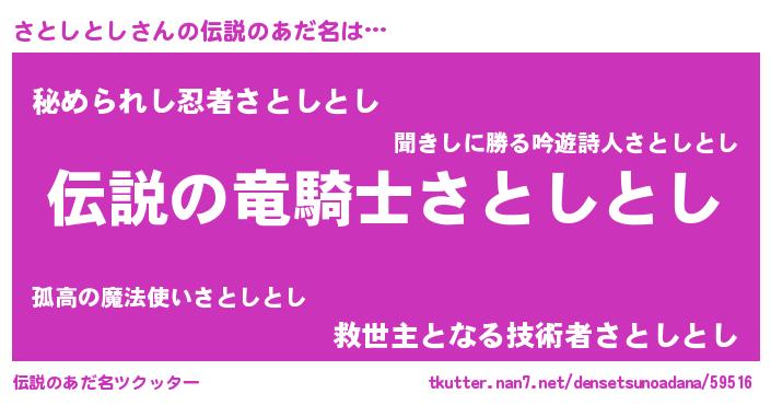 | 女子向けラノベタイトル風あだ名 | 『さとしとしが死なない童話 林檎のさとしとしの診療簿』 |