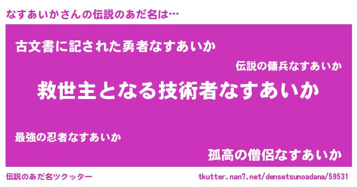 | 男性向けラノベタイトル風あだ名 | 『なすあいか~年齢イコール彼女いない歴の魔法使い~』 |