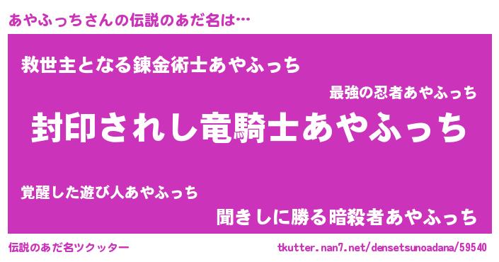 | 男性向けラノベタイトル風あだ名 | 『アヤフッチアートオンライン』 |