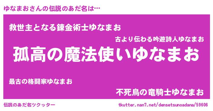 | 意味不明あだ名 | 『自称ゆなまお』『ヨモギ科ゆなまお属』 |