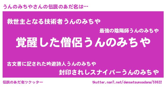 | ヒーロー風カッコイイあだ名 | 『最強戦士ウンノミチヤ』『天弓騎士ウン』 |