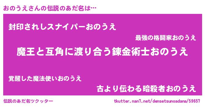 | 男性向けラノベタイトル風あだ名 | 『おまえをオタクにしてやるから、俺をおのうえにしてくれ! 』 |