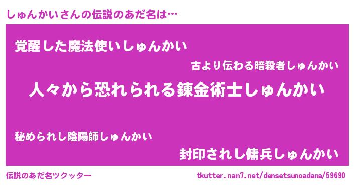 | ヒーロー風カッコイイあだ名 | 『正義の使者しゅんかい』『幻影騎士シュ』 |