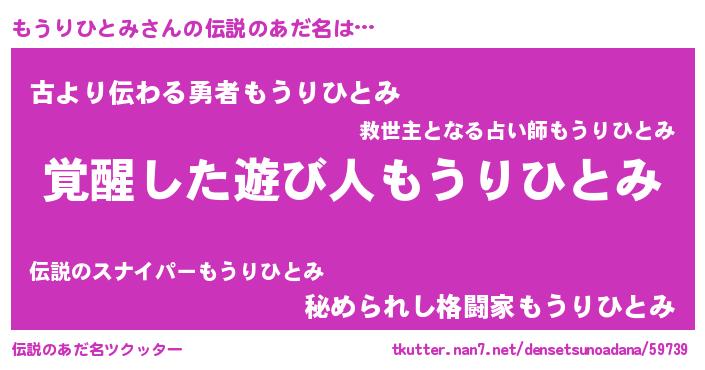 | ヒーロー風カッコイイあだ名 | 『炎刃騎士モウ』『ネオモウリヒトミ』 |