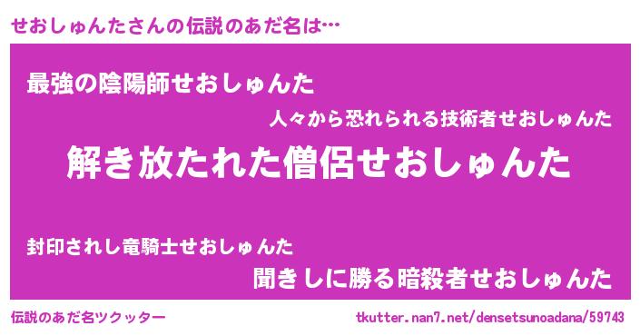 | 男性向けラノベタイトル風あだ名 | 『せおしゅんたの嫁は女の子じゃないと思った?』 |