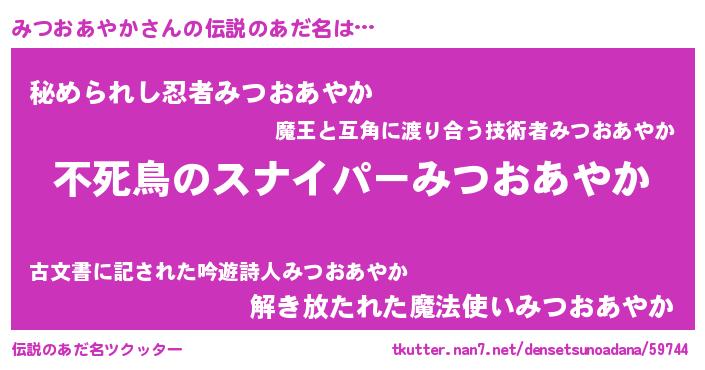 | ヒーロー風カッコイイあだ名 | 『スーパーミツオアヤカ』『天弓騎士ミツ』 |