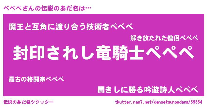 | 胡散臭い通販商品みたいなあだ名 | 『あなたにだけ特別に提供する100年もののヴィンテージワイン…その名も「ぺぺぺ」』 |