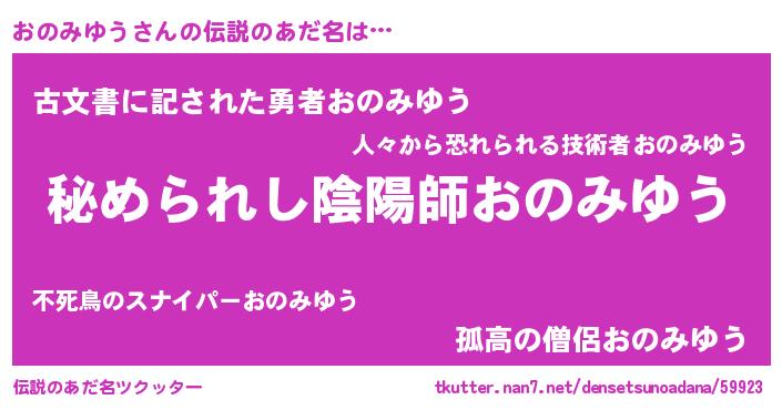 | ヒーロー風カッコイイあだ名 | 『仮面オノダー』『最強戦士オノミユウ』 |