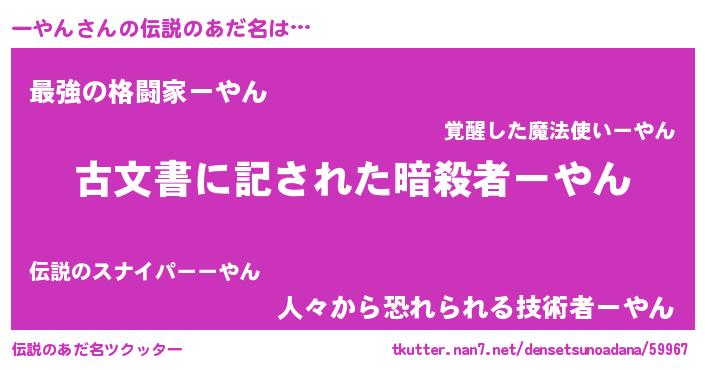 | 男性向けラノベタイトル風あだ名 | 『ーやん~年齢イコール彼女いない歴の魔法使い~』 |