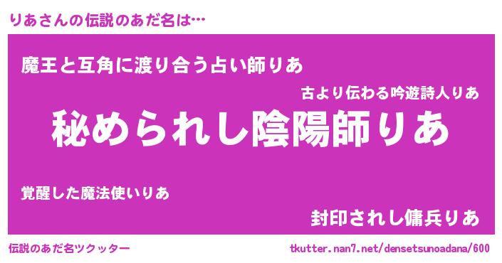 | 女子向けラノベタイトル風あだ名 | 『りあの雑貨屋さん』『死神りあの再婚』 |