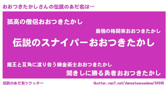 | 男性向けラノベタイトル風あだ名 | 『オオツキタカシスレイヤー』 |