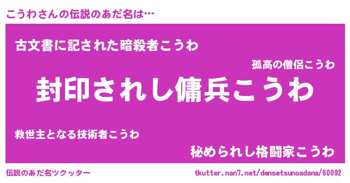 | 胡散臭い通販商品みたいなあだ名 | 『あなたにだけ特別に提供する限定10本のレアな日本酒…その名も「こうわ」』 |