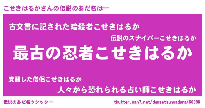 | ヒーロー風カッコイイあだ名 | 『仮面コセダー』『ネオコセキハルカ』 |