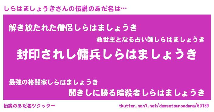 | 男性向けラノベタイトル風あだ名 | 『しらはましょうき~年齢イコール彼女いない歴の魔法使い~』 |