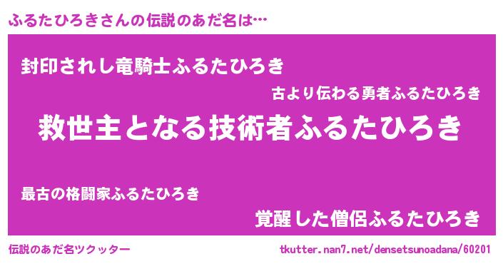 | 男性向けラノベタイトル風あだ名 | 『ふるたひろきに滅ぼされるだけの簡単なお仕事です』 |