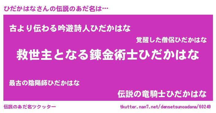 | 男性向けラノベタイトル風あだ名 | 『ひだかはな~年齢イコール彼女いない歴の魔法使い~』 |