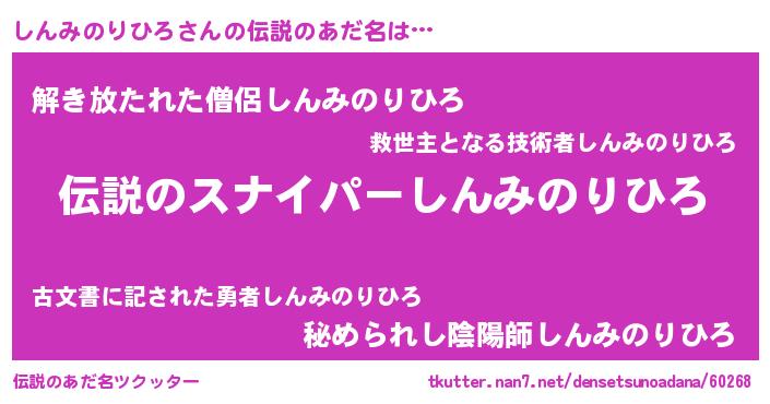 | 男性向けラノベタイトル風あだ名 | 『しんみのりひろの憂鬱』 |