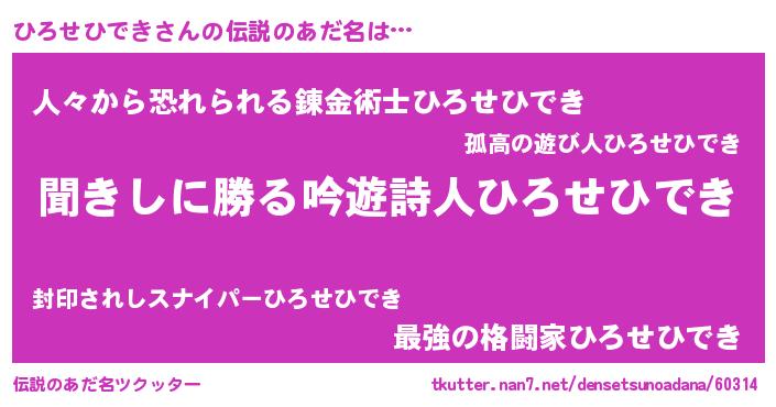 | ヒーロー風カッコイイあだ名 | 『ネオヒロセヒデキ』『暗黒騎士ヒロ』 |